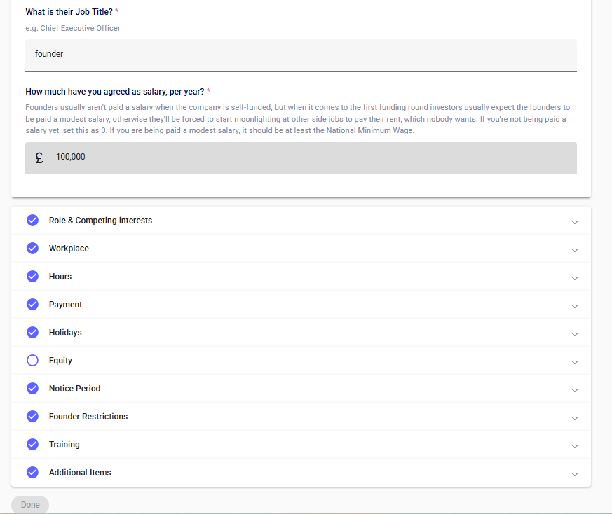 In the early stages of the business the founders generally aren't paid a salary - if that's your situation then when creating your founder agreement just set the salary to £0 and then we'll create what we call a "founders pledge" which omits everything related to salary and employment.