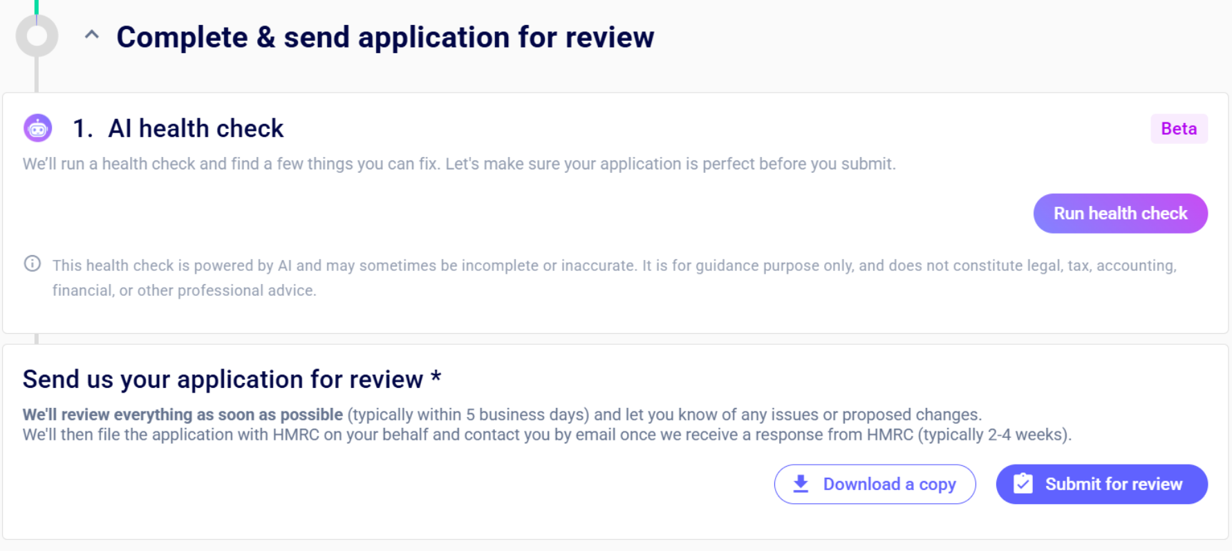 Once everything is completed and uploaded, you will notice that you can use our AI Health Check tool for a quick check of your application. We encourage you to do run this as it will flag any items that are missing or need amendments still. You can rerun the check as many times as you wish.