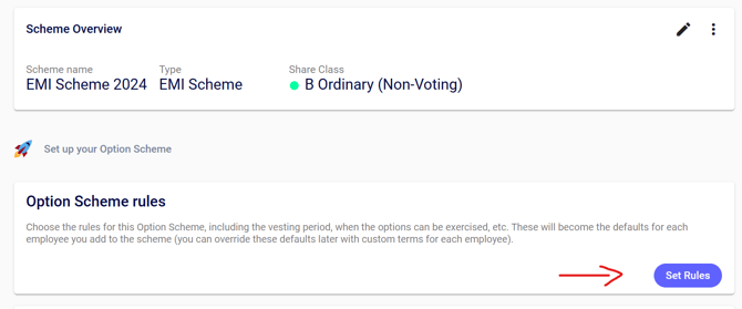 Next, set the details of the scheme on this page where it says Set Rules. You can set these details now or after the valuation is approved. You can always come back and change the details anytime before the final step of adopting the scheme rules and you can also reach out to your scheme owner with any questions.