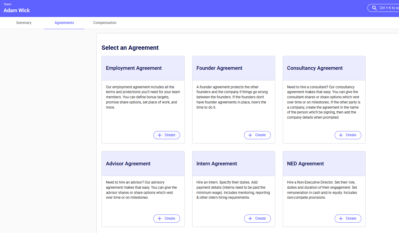 This guide will show you how to create an Employment Agreement on the platform.