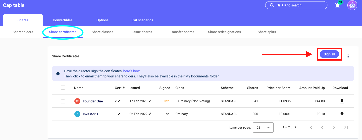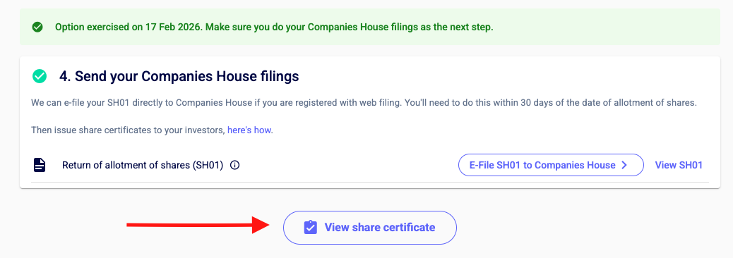 Click 'View share certificate' at the bottom of the exercise workflow to go to your share certificates page (can also be found under 'Cap Table' tab):