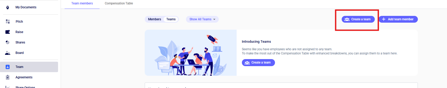 Every time you create Employment and Founders Agreements, you’ll automatically add these members to the Teams section on SeedLegals. From here, you can assign them to a specific team to keep track of who’s where and the size of each team.