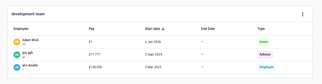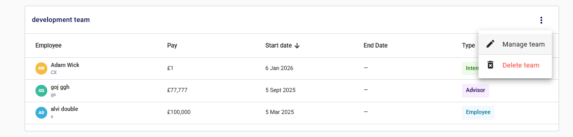 You can use the Team section to manage your employees and track the cost of your talent on the company payroll