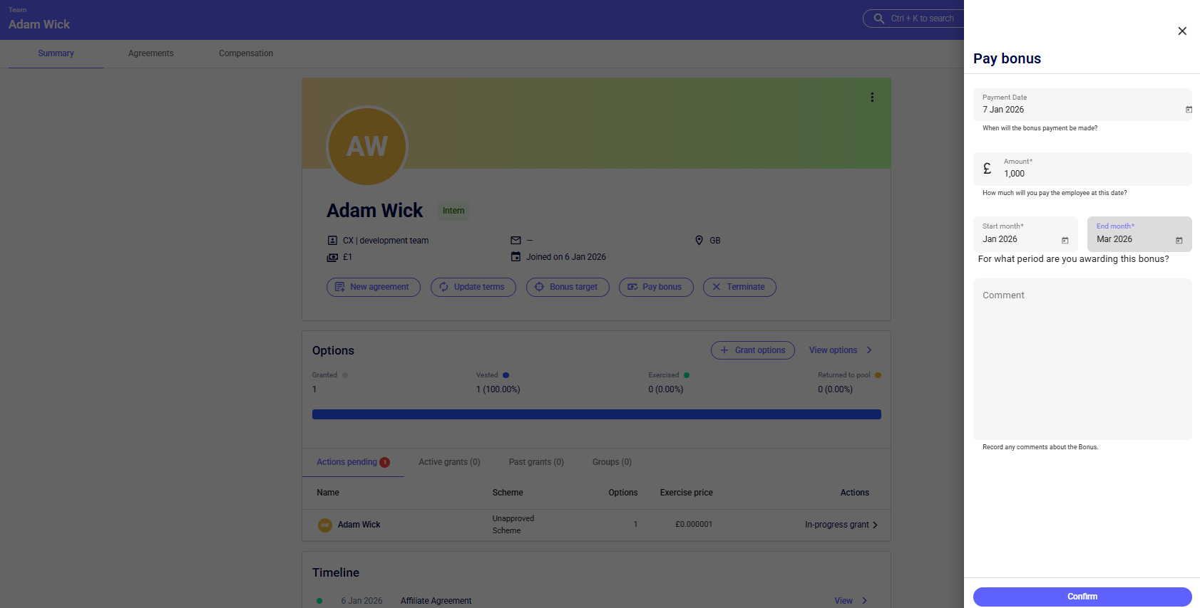 You can set bonus targets for your team by clicking on their name, inputting the amount, performance period, payment frequency, target start date and any additional comments about the bonus. The compensation table will automatically update to reflect the Bonus Targets.