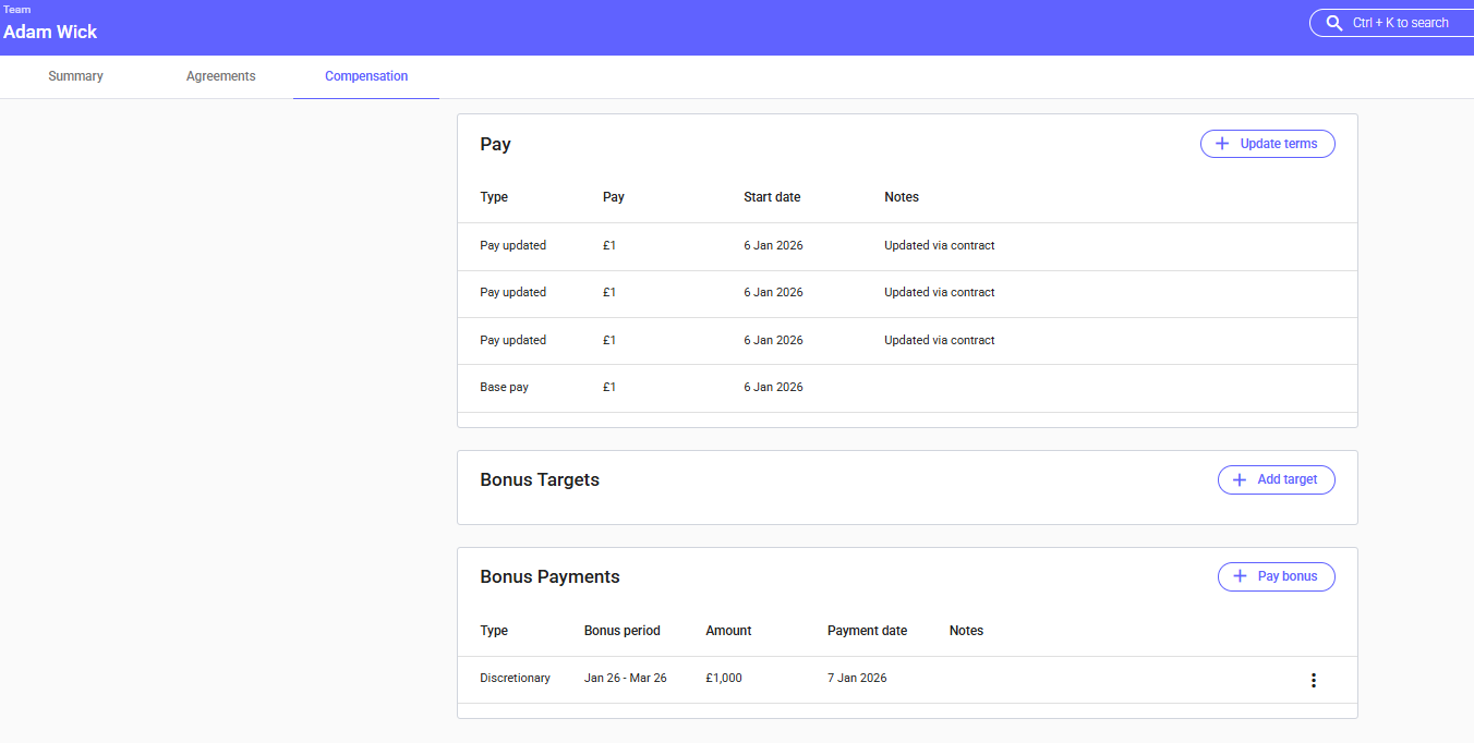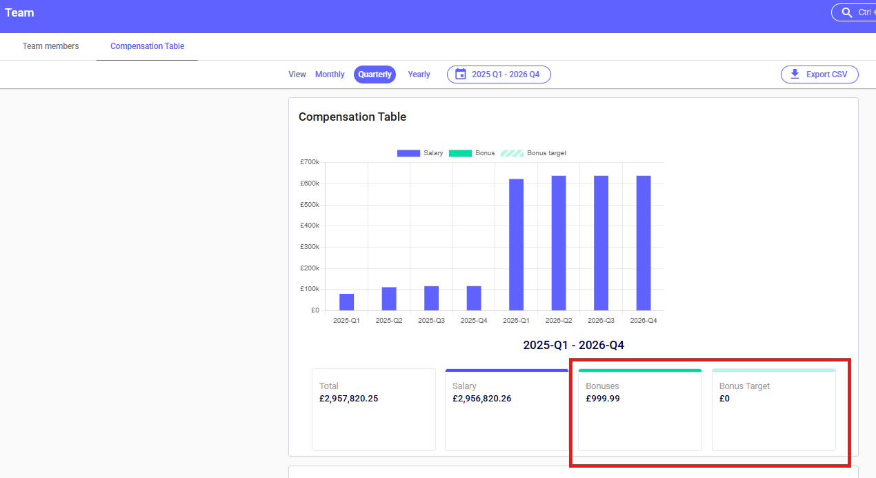 When paying out a bonus to your team, select the team member > click Pay Bonus > input the bonus details (amount, date and any additional comments). The compensation table will clearly display the amount paid out in bonuses compared to outstanding targets.