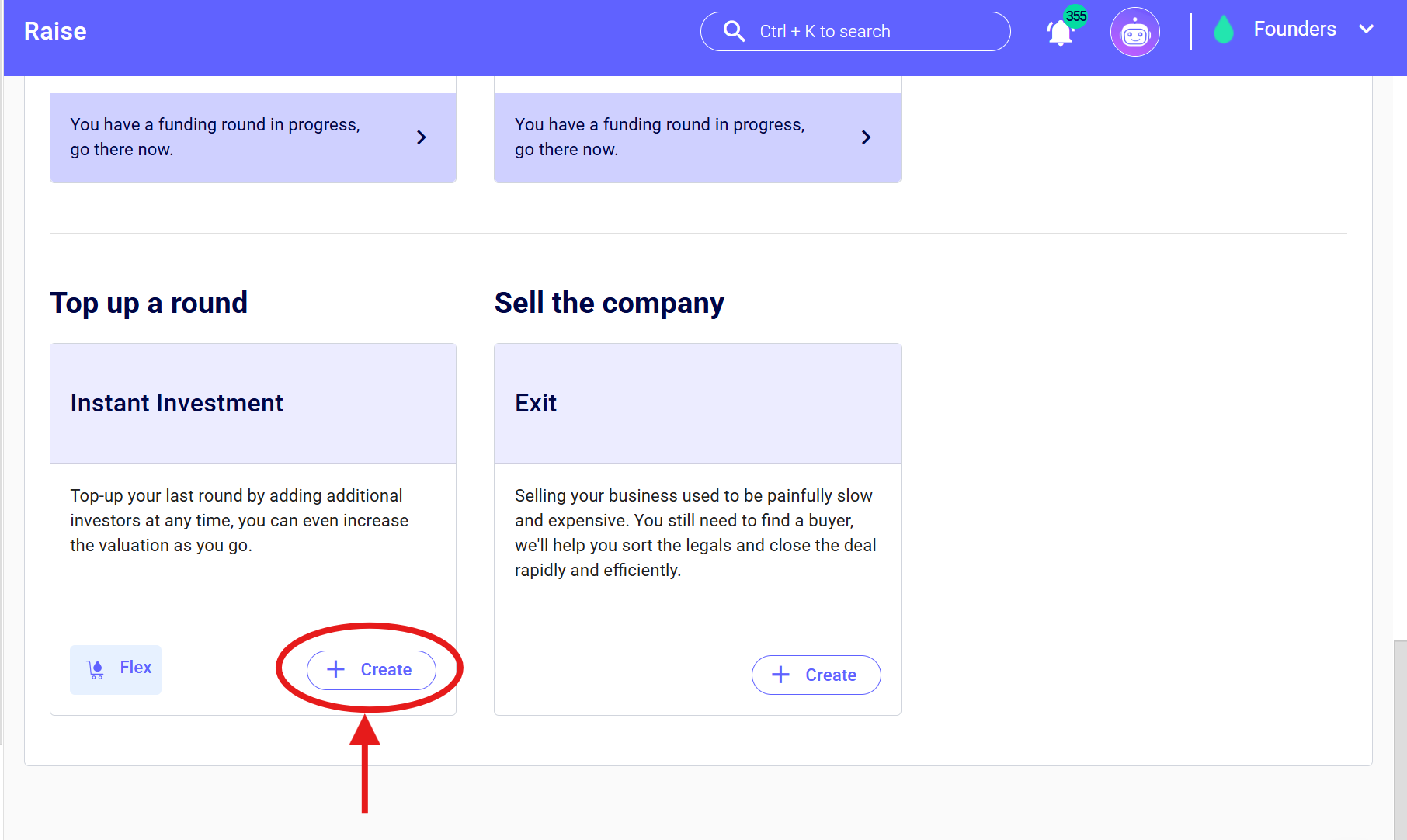 Head to the Raise tab and click Create, then scroll down until you see Instant Investment.