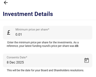 Then fill in the total raise amount, click Start now, and then fill in the minimum price per share, and then hit Confirm.