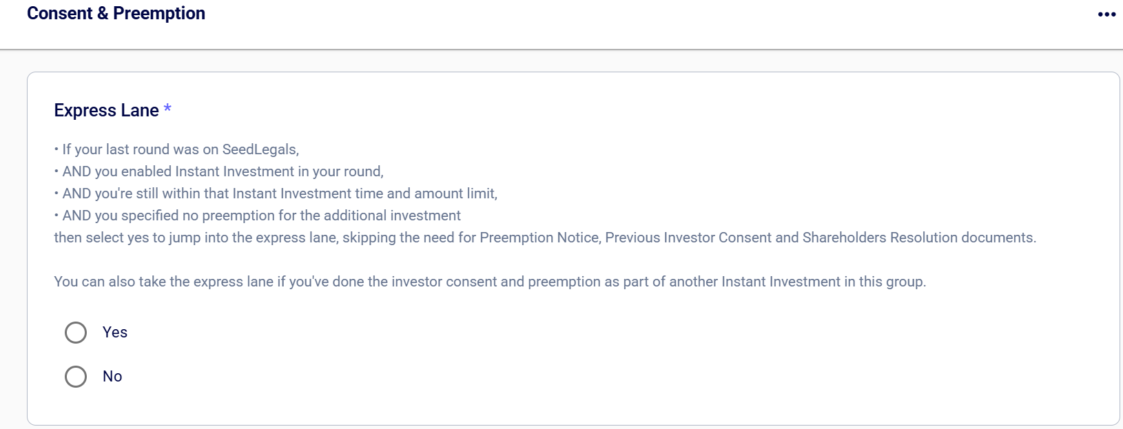 Confirm whether you need investor consent and preemption, or if you can use the Express Lane. If you have previously carried out a Funding Round on SeedLegals, then go to the Funding Round Key Deal Terms to check whether you can use the Express Lane. This helpful guide explains how to check your Key Deal Terms.