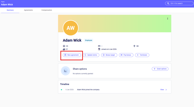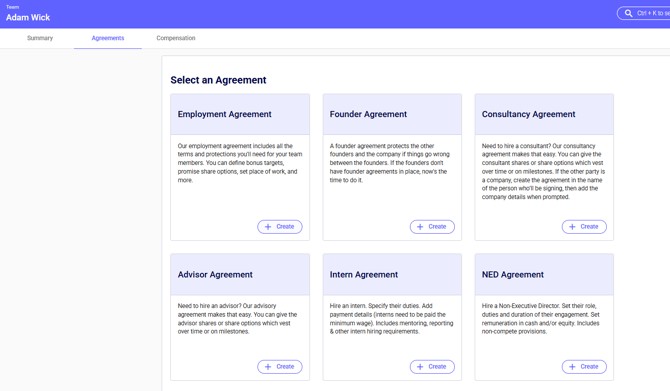 Then click on New Agreement where you can choose if this is a founder or an employee and fill in the remaining terms. Make sure to hit Done: