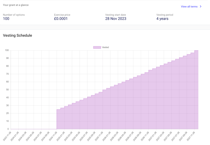 - Over a period of years - this is normal time-based vesting, where options will vest over a set period, with a specific frequency e.g. over 3 years, with monthly vesting.