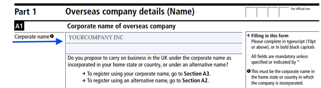 Before completing sections A1 and A2, check if the company name you’re registering is available using the company name availability checker. If the overseas company’s corporate name is considered to be the ‘same as’ another company name on the Companies House register, you will need to register the company under a different name.