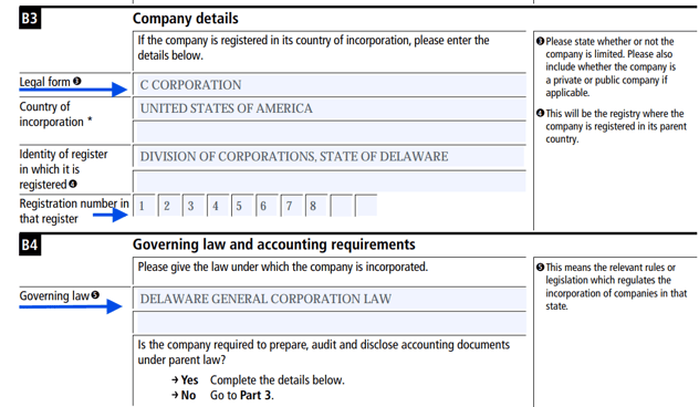 In section B3 please give the details of the overseas company. In most cases it is a C Corporation, in the US, State of Delaware. You will need to add your Delaware company number, so have this ready. Once completed, head to section B4 where you will need to give the law under which the company is incorporated.