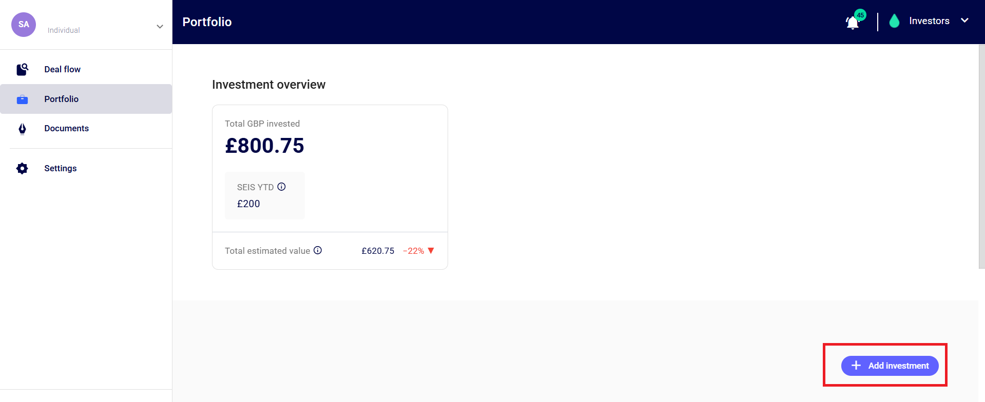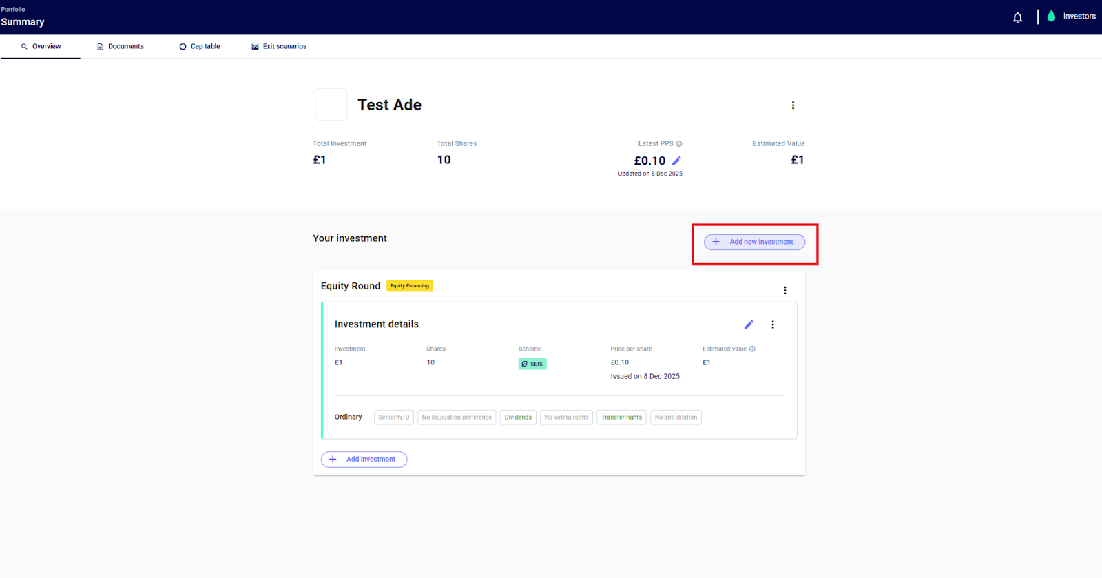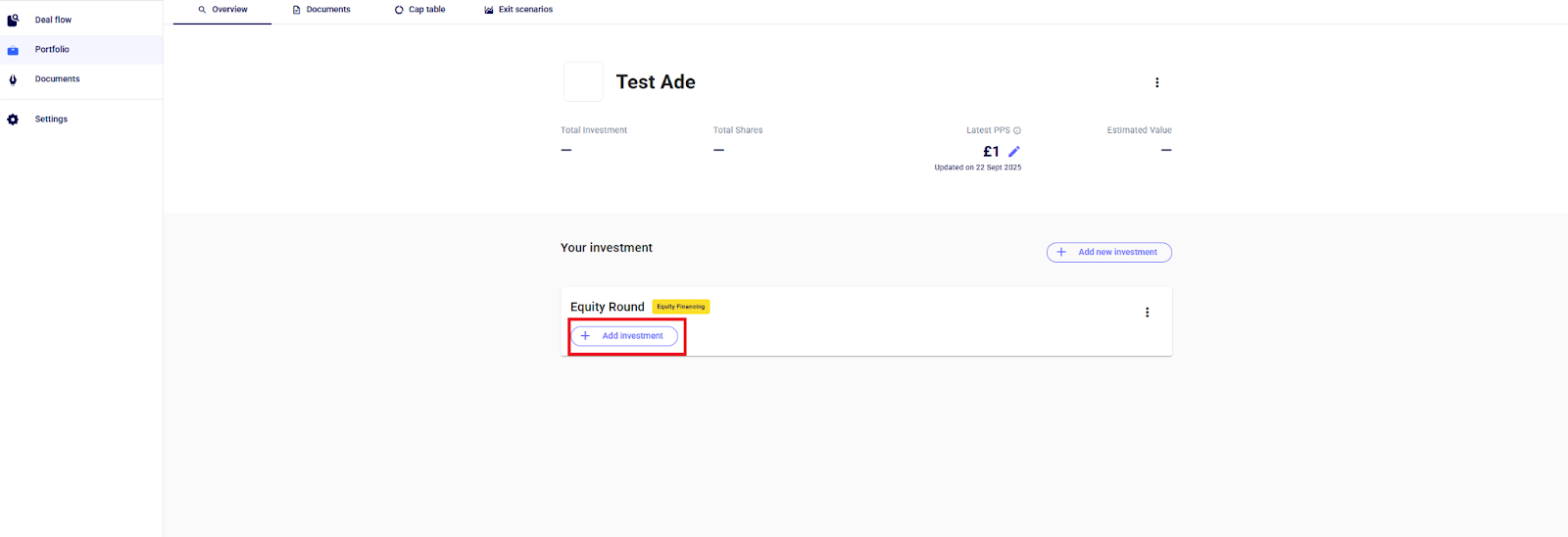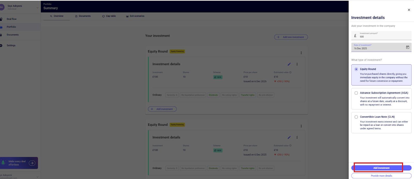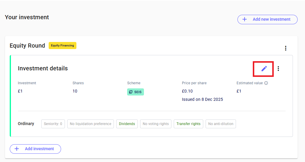 💡You can also add more investments you made through SeedLegals to your portfolio by clicking on “+ Add Investment”.