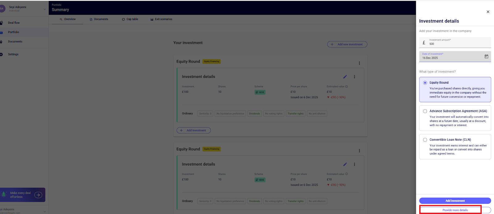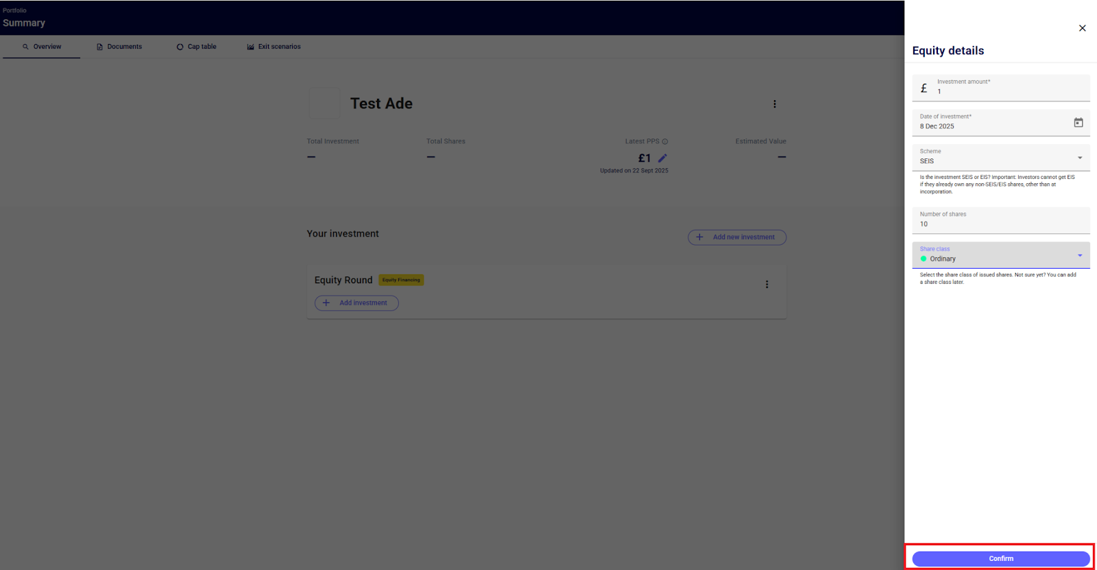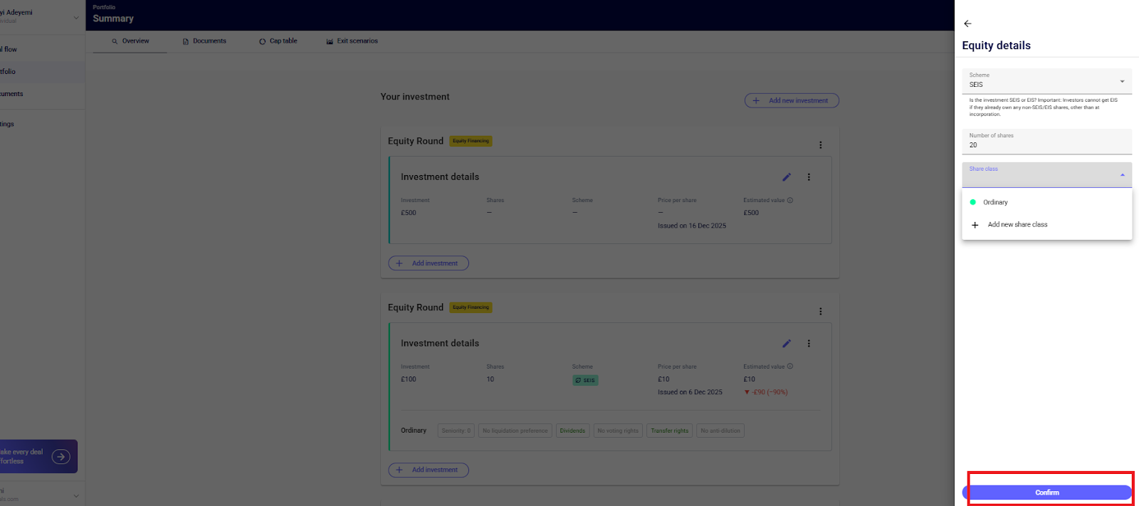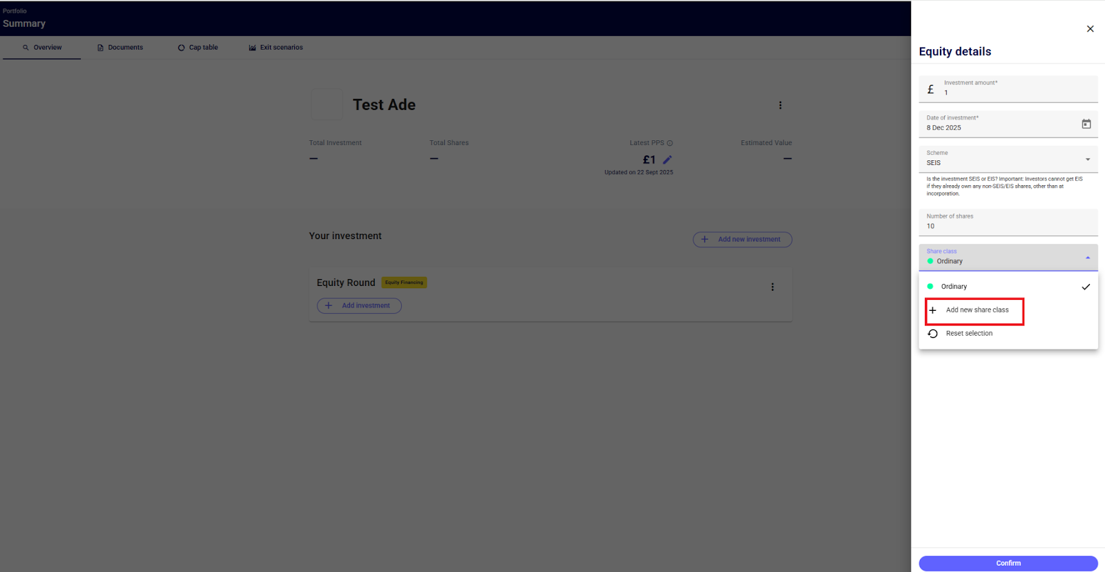 Next, start to enter the details of the investment such as the investment amount, date of investment, scheme, number of shares and share class. You can do this by clicking “+ Add Investment” directly below the Equity Round > enter the details of the investment > confirm.