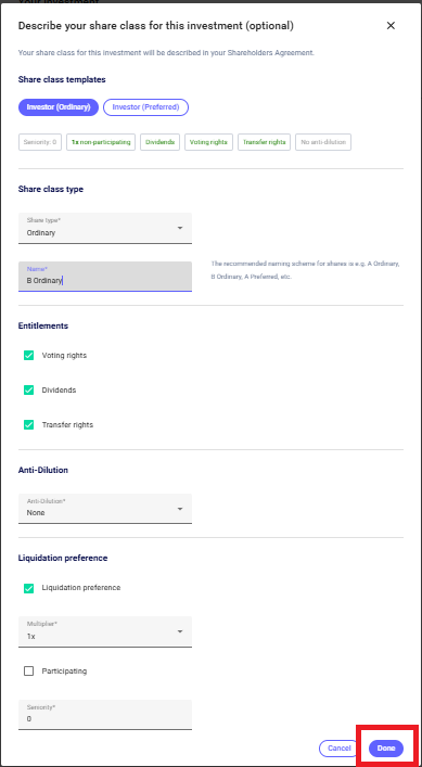 💡You can also add a new share class by clicking on “+Add new share class” > done.