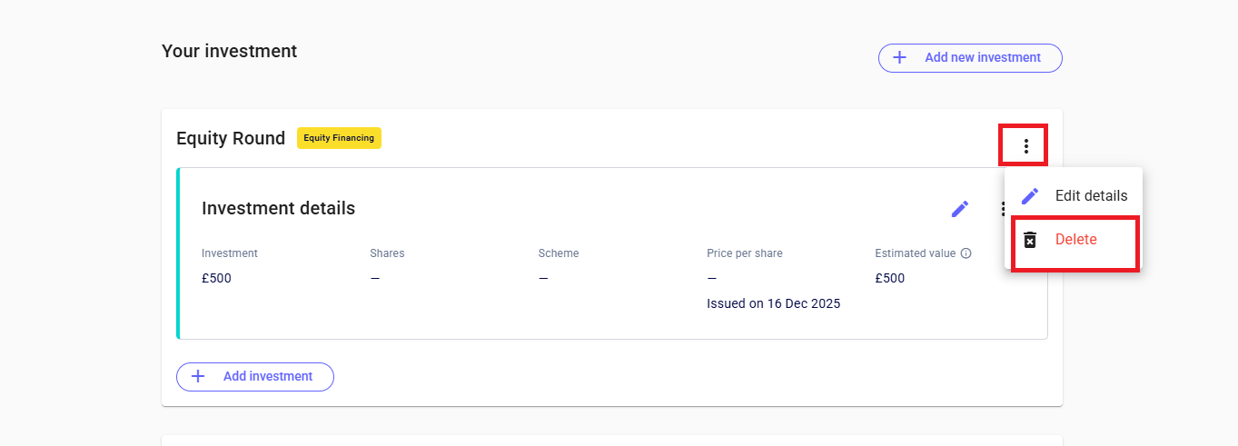 💡You can also delete an investment by clicking the three dots next to the investment details > delete.