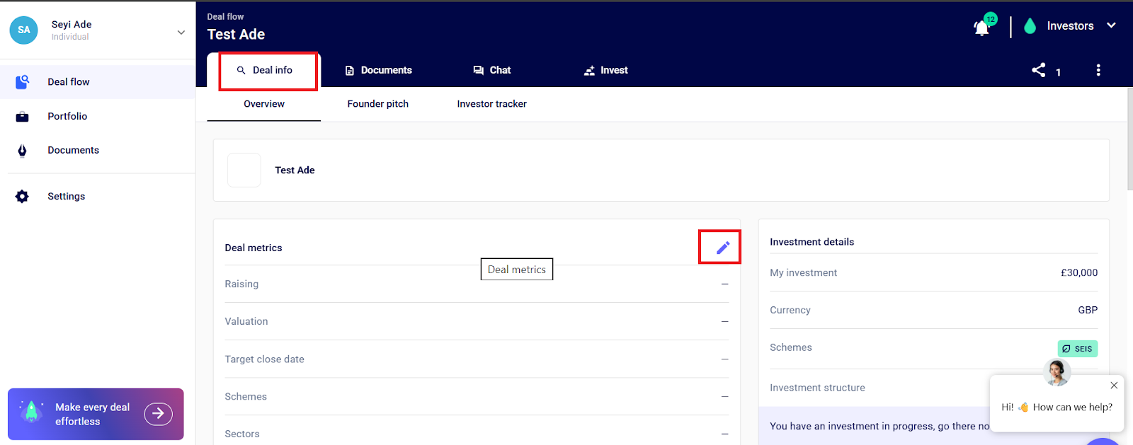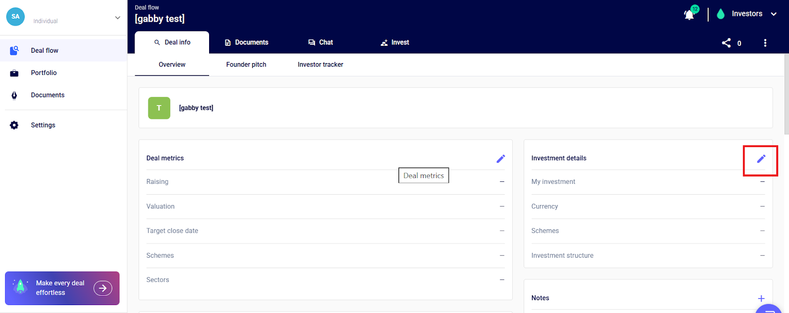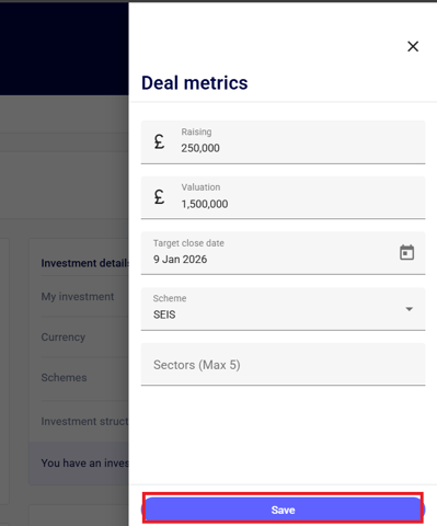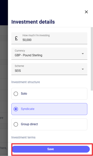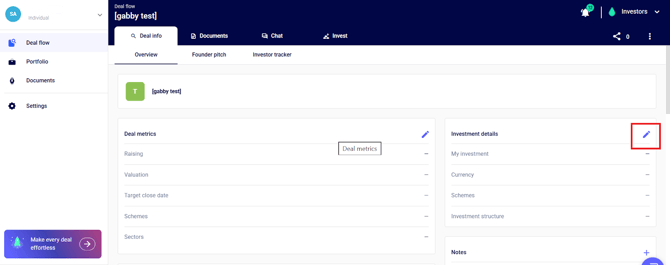 Next, go ahead to enter the details of your investment as a syndicate by heading to the Deal info tab > Overview, click the pencil icon next to Investment details and start entering the details of your investment and save.