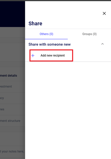 Step 3: Share the deal with a recipient by clicking on the “share” icon at the top right corner of the page > +New recipient, and choose either individual or company.