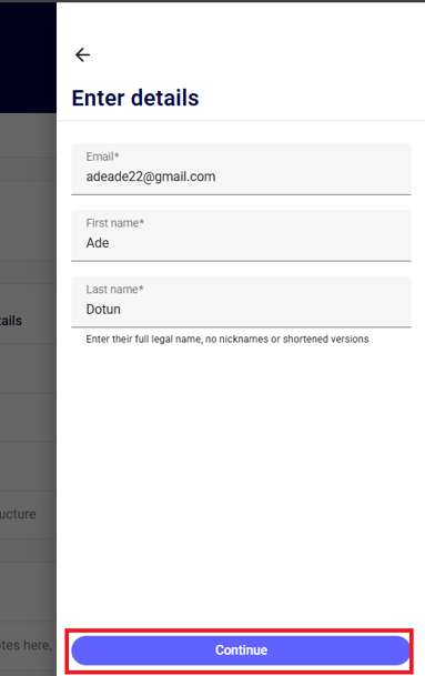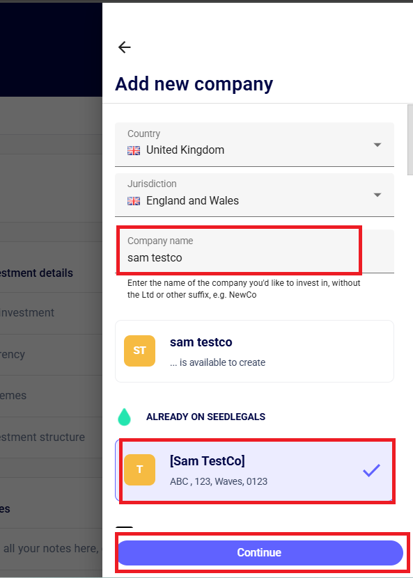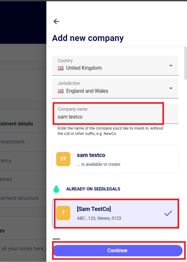 For companies, enter the name of the company as registered on SeedLegals, and click continue.