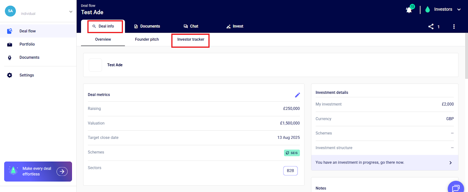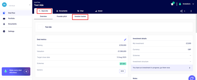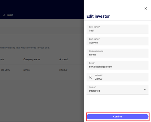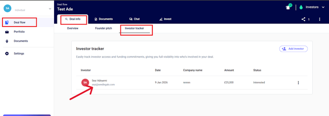 Next, go to the “Deal info” tab, and click “Investor Tracker”. You will see a list of investors who have registered their interest in your deal. Click the specific investor and click “confirm”.