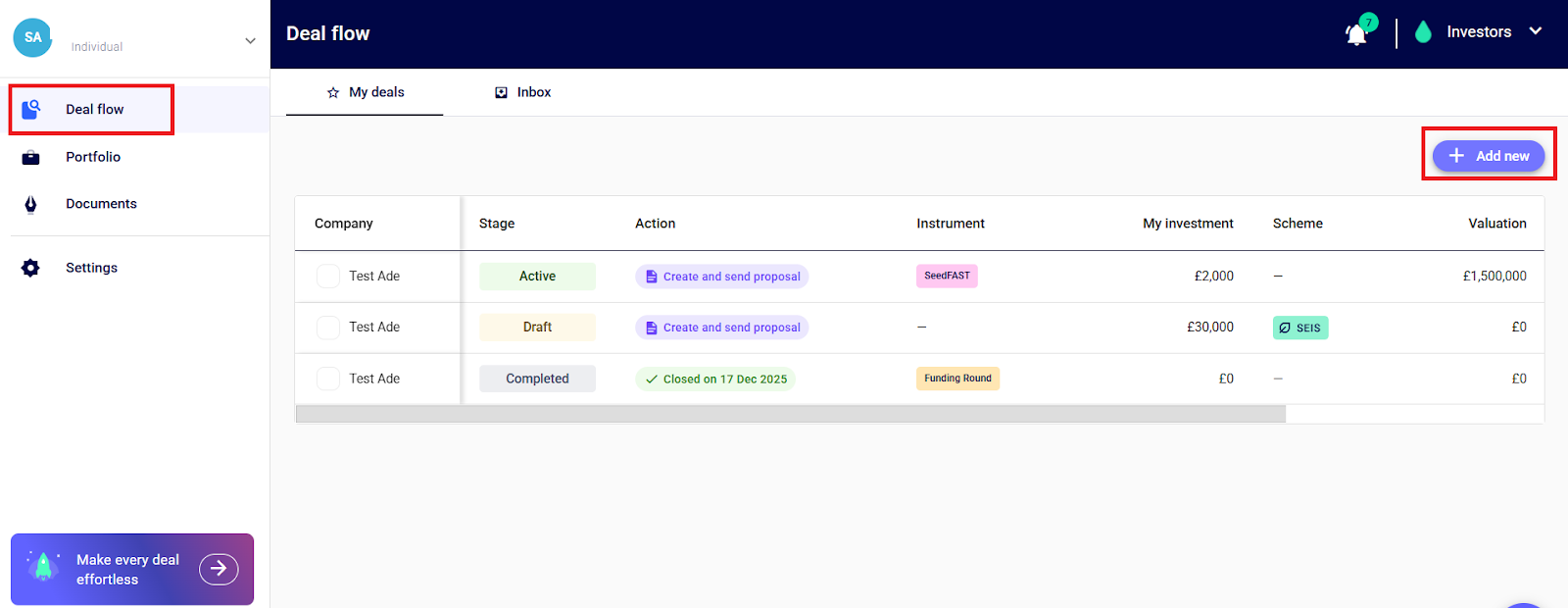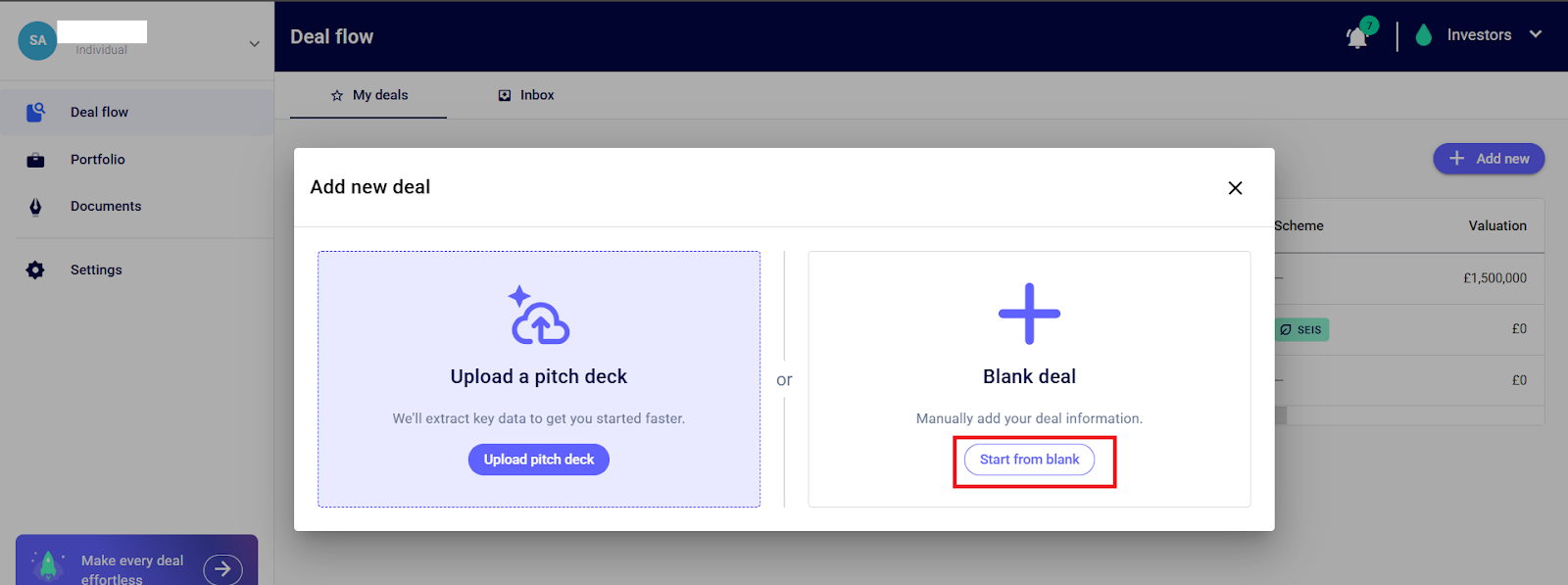 Step 1: Go to the “Deal Flow” section on the left-hand side of the navigation panel, click “+ Add new”, and click “Start from Blank”
