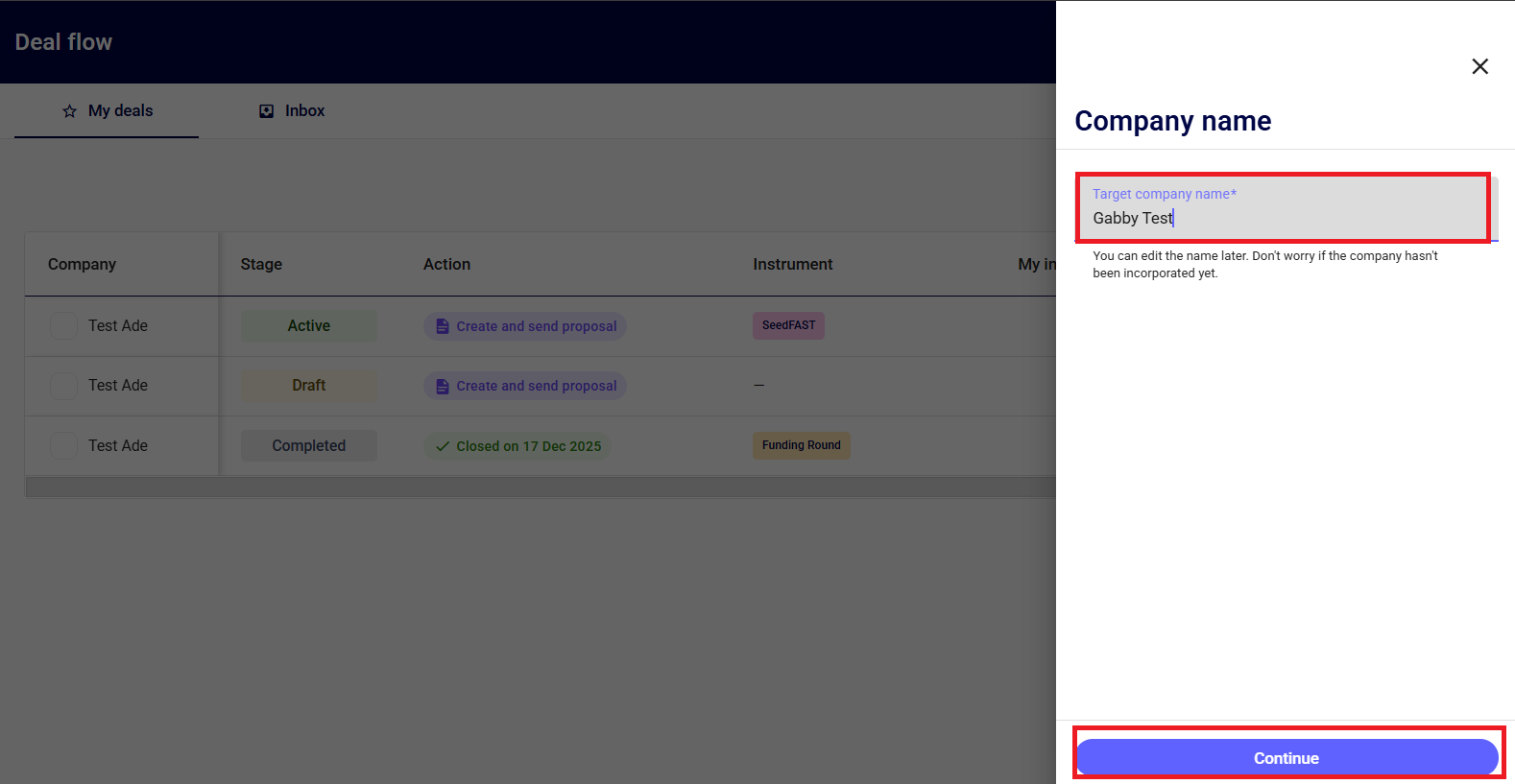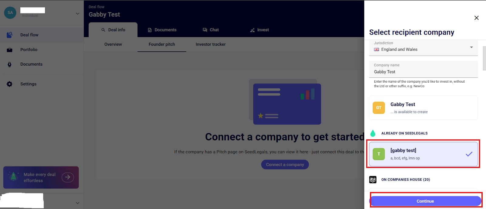 Next, select the name of the company that’s already registered on Seedlegals, and click continue