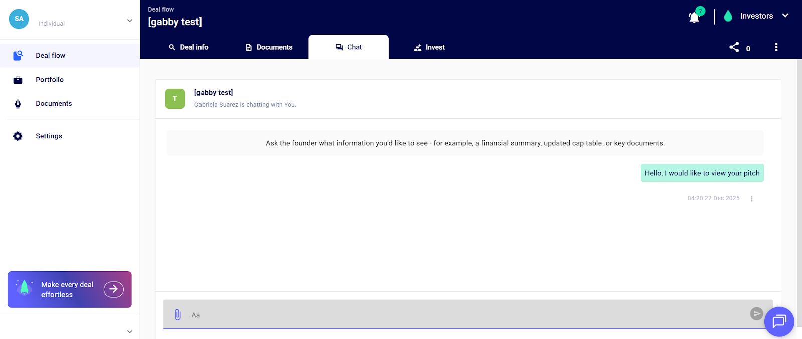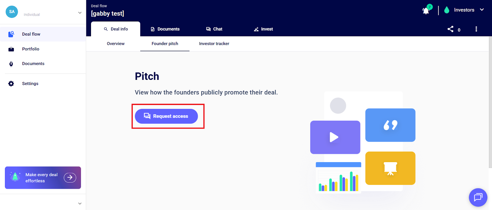 Step 4: Request Access to the company’s pitch by clicking on “Request Access” and sending the founder a message using the chat feature.