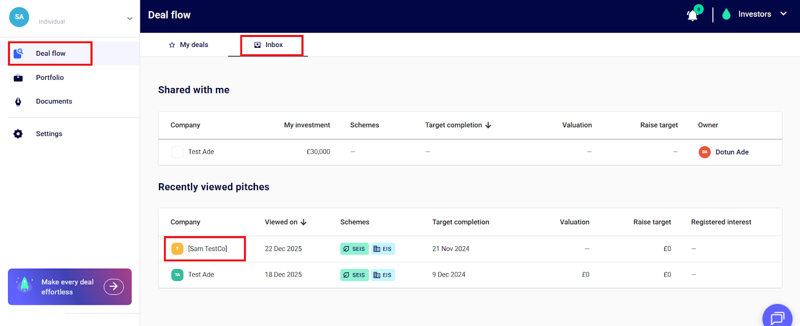 Step 5: Register your interest in the company by heading to “Deal Flow” > Inbox. Navigate to the “Recently viewed pitches” section, and click the specific company’s pitch page you have already viewed.