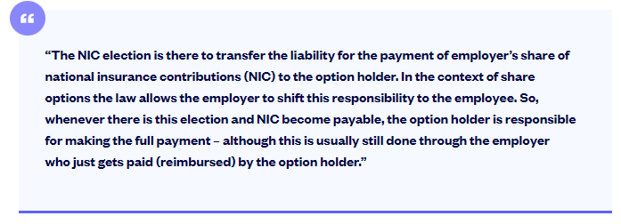Employers may recover NICs payable on share options from employees via signing an NIC Election whereby the employer and employee can agree or jointly elect for the employer to transfer the NIC liability onto the employee. Signing the NIC Election ensures any contributions arising from the exercise remains the employee’s responsibility and the option holder is accountable for making the full payment; although this is typically still facilitated through the employer who simply receives reimbursement from the option holder.
