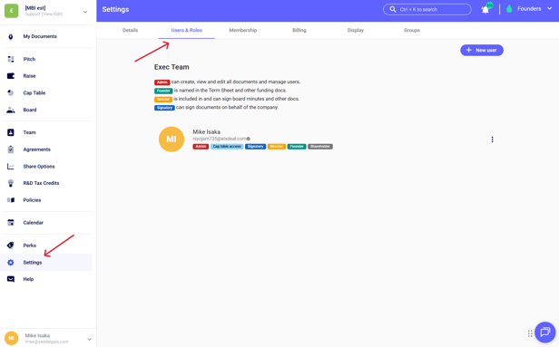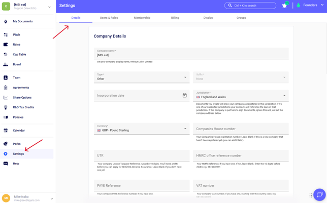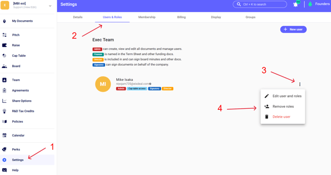 - Then, go to "Settings", add the Company’s details in "Details" and add the representative of the company in "User & Roles." Finally, you can remove yourself by clicking on the 3 dots on the right of your name.