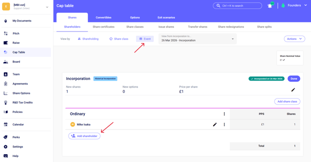- If one of your shareholders is a Company - you can go on “Event” click on the crayon to “add a new shareholder” and select “Company”.