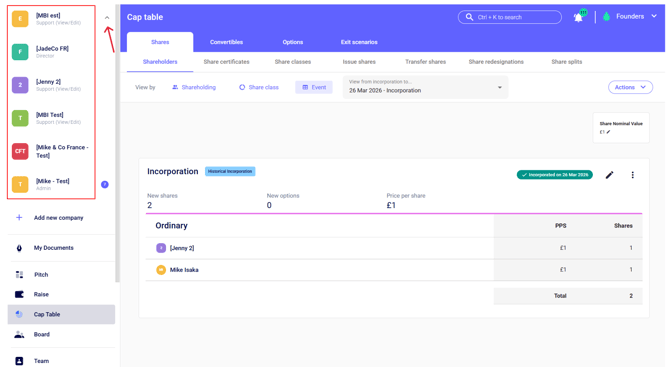 - If you have created a new company, you are automatically an administrator of this Company on SeedLegals, and you can find it amongst all the companies you are an administrator of by clicking on the name of the company on the top left corner.