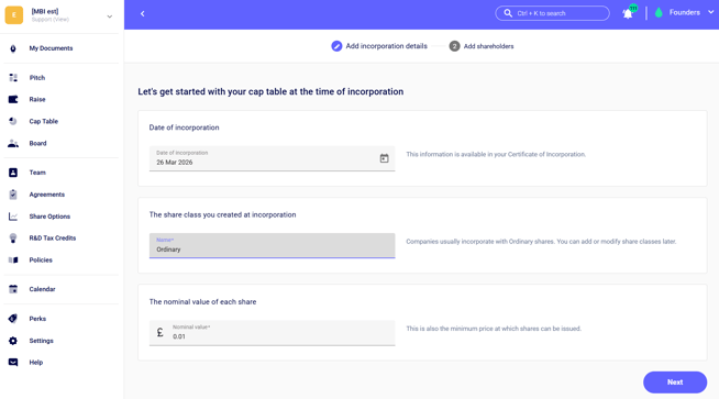 - Add the number of shares held by each shareholder and hit the button ''Next''