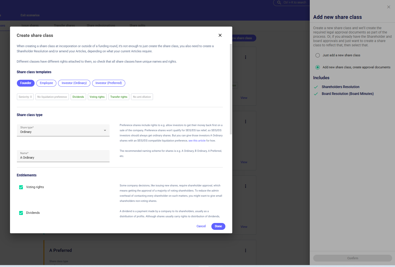 Once you hit confirm the share class pop up will allow you to customize your share class. Here you can issue Founder, Employee, Investor Ordinary or Preferred shares with a range of entitlements such as voting rights, transfer rights, and dividends. It will also allow you to set the terms of any anti-dilution rights or liquidation preferences.