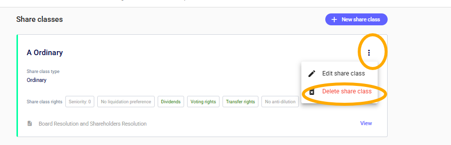 Alternatively, within the ‘Shares’ Navigation panel select ‘Cap Table’. In the top right hand corner, click on the three vertical dots and select ‘Edit share classes’. From there you can select ‘+ New share class’ again as seen in the above diagram.