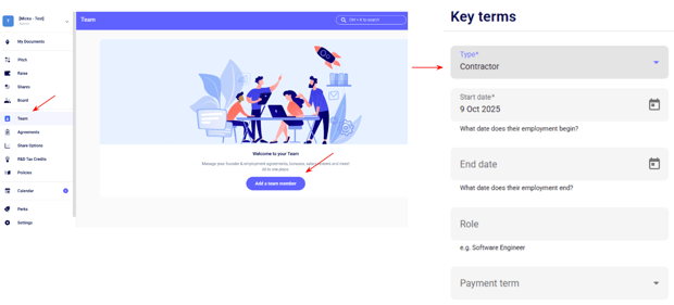 One simple workflow: Add a new team member and create their agreement right from the Team section.