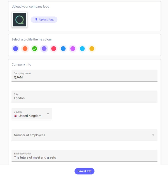 Here you can upload your company logo and basic information about your business, including - where you are located, the number of employees you have, a brief description of what the business does, your company’s social media handles, and the sectors your business operates within.