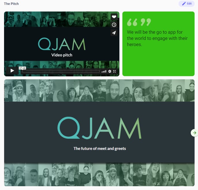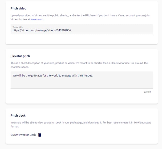 Then we have the meat of the page, your actual Pitch. Here you can include a video, your pitch deck and a short elevator pitch.