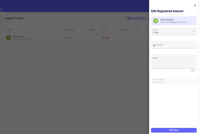 Once they have registered interest, their details will now appear in the Investor Tracker tool, including their name, email and any message they have sent you.
