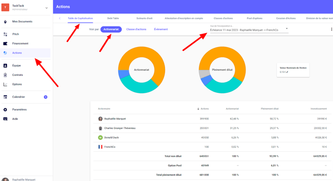 Vous verrez ainsi dans "Actionnariat" les personnes actuellement au capital de la société, le pourcentage détenu par chaque actionnaire et le montant total que la société a levé jusqu'à ce jour.
