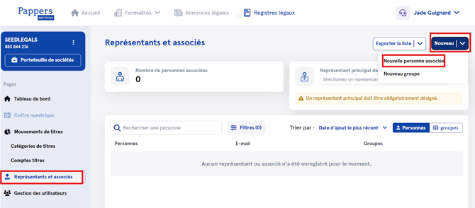 - Rendez-vous dans la partie Représentants et associés et cliquez sur Nouveau puis Nouvelle personne associée.